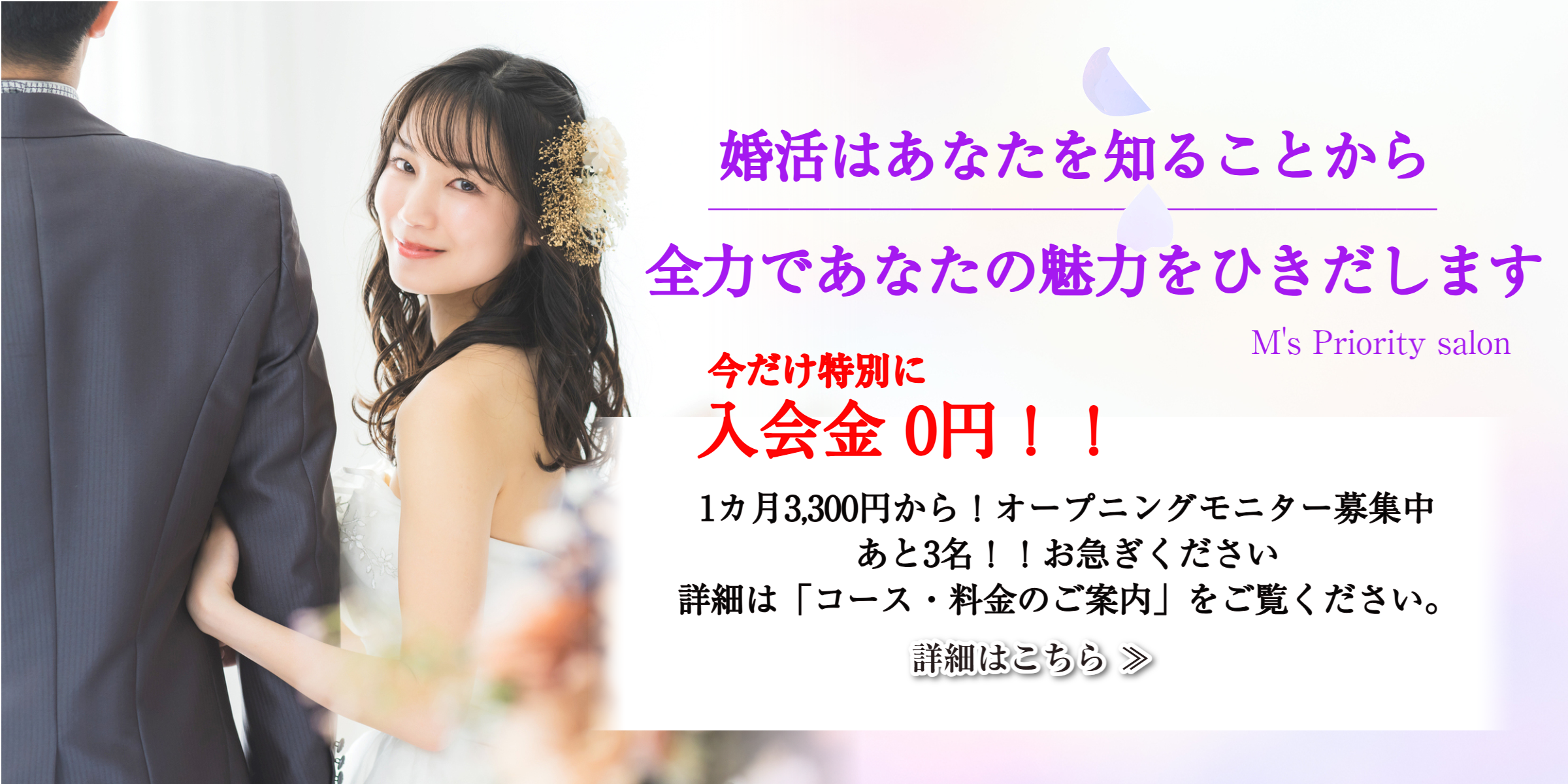 M's Priority salon(エムズプライオリティサロン)は、会員数98,246名以上、東証プライム上場、日本最大級の結婚相談所ネットワーク「IBJ」の正規加盟店です。